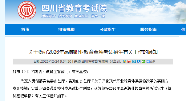 近日,四川省考试院发布《关于做好2026年高等职业教育单独考试招生有关工作的通知》西航君为大家整理了2026年高职单招,报名办法、时间安排及志愿填报等内容快来一起看看吧!