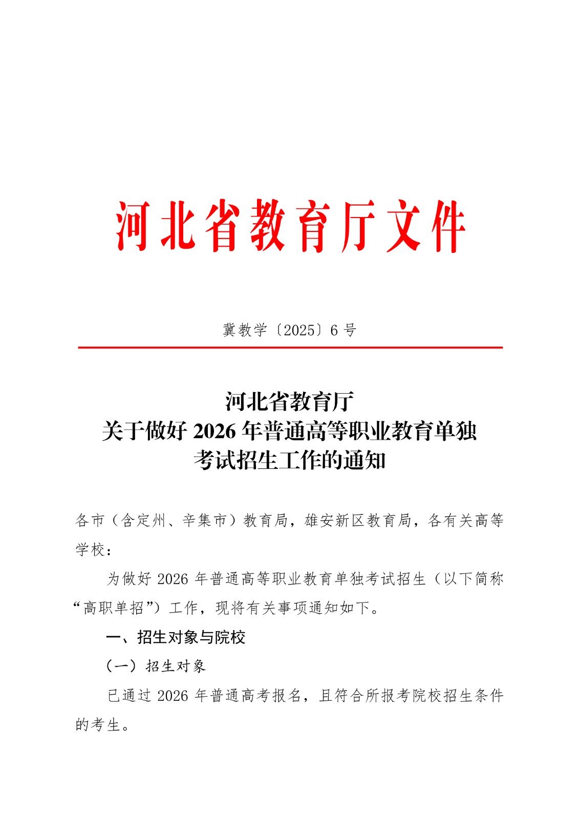 河北省教育厅关于做好2026年普通高等职业教育单独考试招生工作的通知