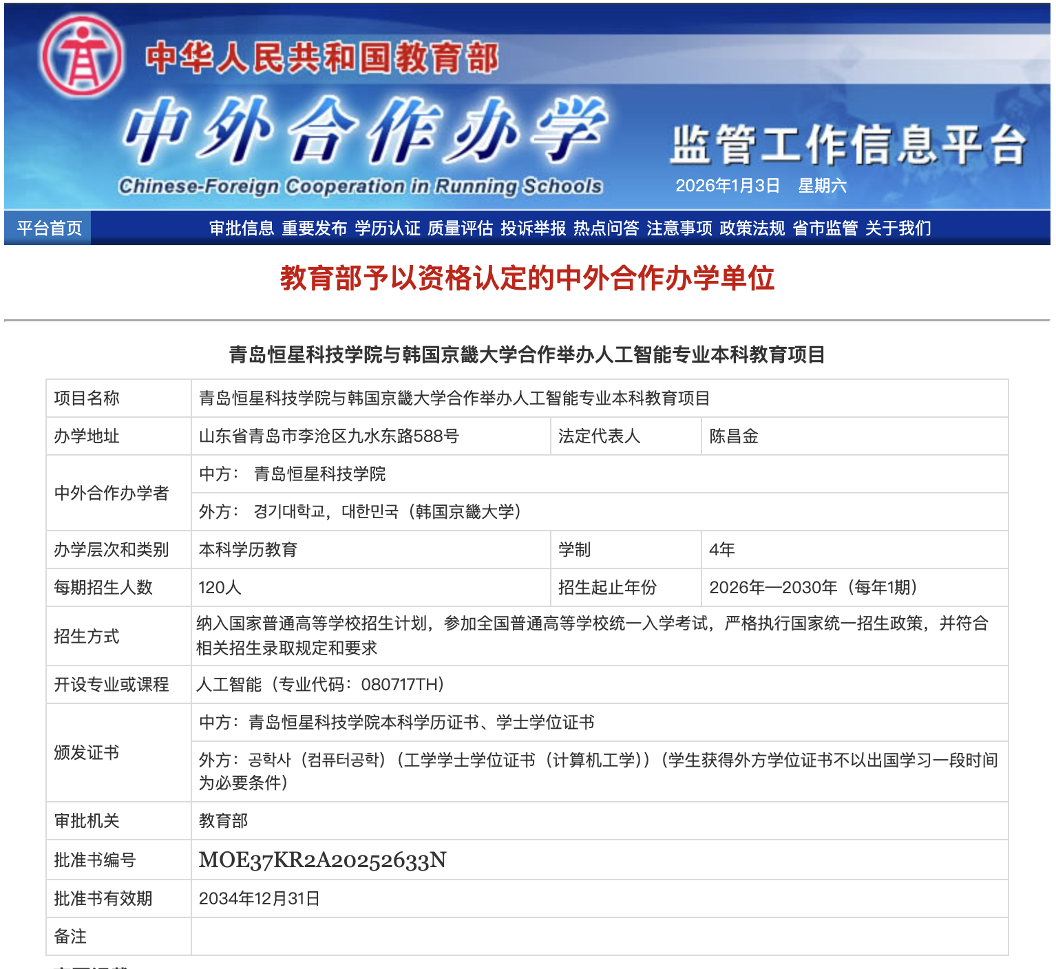 近日,教育部公布中外合作办学项目审批结果,我校与韩国京畿大学合作举办的人工智能专业本科教育项目成功获批。这是我校首个获教育部批准的中外合作办学项目,标志着学校在引进优质国际教育资源、推进人才培养国际化方面迈出了重要一步。