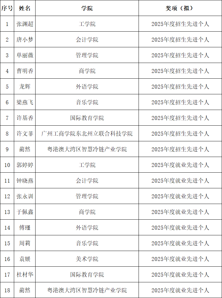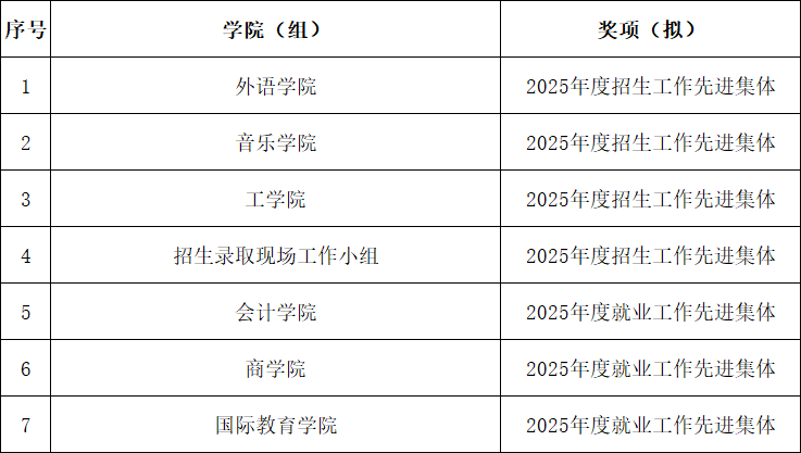 为了表彰先进,树立典型,根据《关于评选2025年招生就业工作先进集体和先进个人的通知》文件要求,本着客观公正、精确量化、严格标准、择优激励的原则,经学院推荐与学校评审,综合衡量各二级学院2025年招生就业工作开展情况,遴选出2025年招生就业工作先进集体和先进个人。现将拟表彰的先进个人和先进集体公示如下: