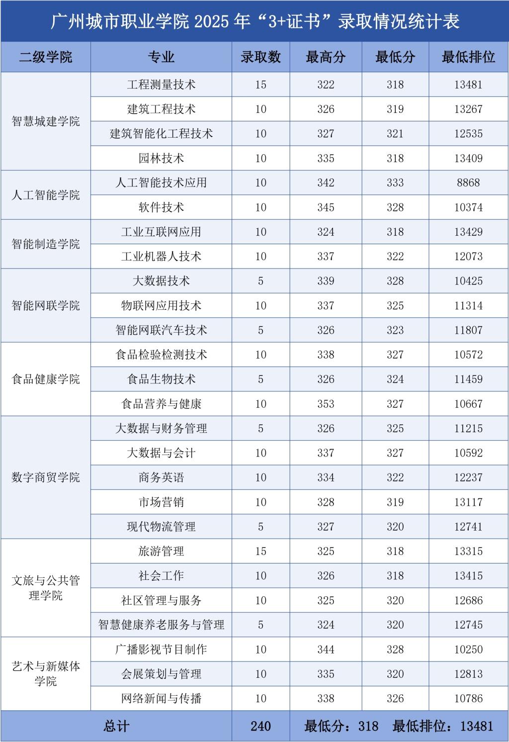广州城市职业学院2025年“3+证书”各专业录取情况
