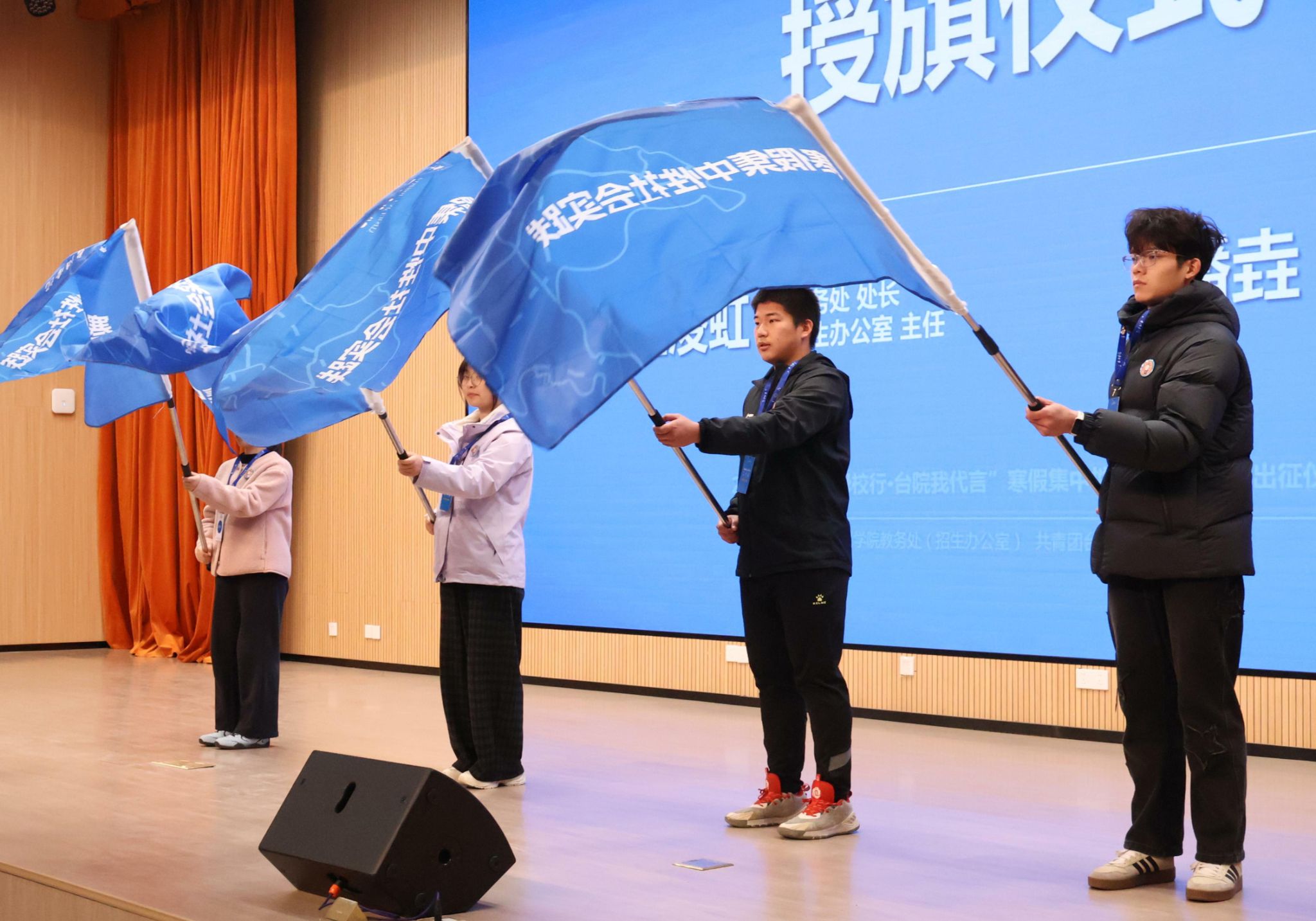 学校教务处处长、招生办公室主任金凌虹,校团委书记潘垚共同为2026年寒假社会实践学生代表佩戴活动徽章和工作证,并向各实践代表队授旗。