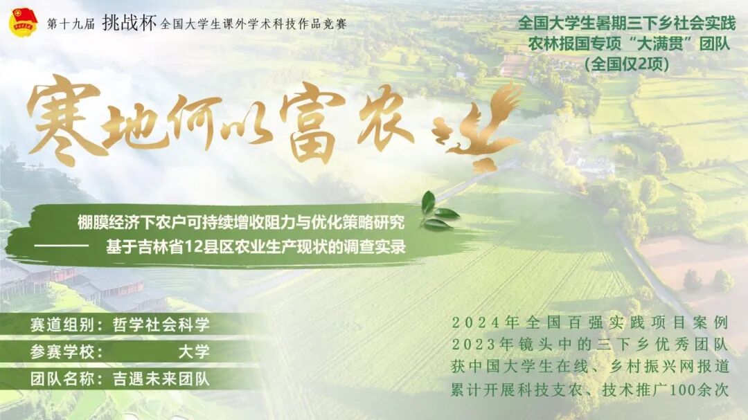项目简介:本项目直面国家“藏粮于技”战略在寒地农业中的实践难题,扎根吉林省12县区,通过大规模实地调研与扎根理论分析,精准诊断出制约棚膜经济可持续发展的三大结构性瓶颈。团队致力于打通农业技术赋能的关键堵点,所构建的治理新模式已在实践中验证成效,相关成果获政协批示、专家推荐及多家权威媒体深度报道,为寒地农业可持续增收提供了坚实的理论支撑与可行的实践路径。