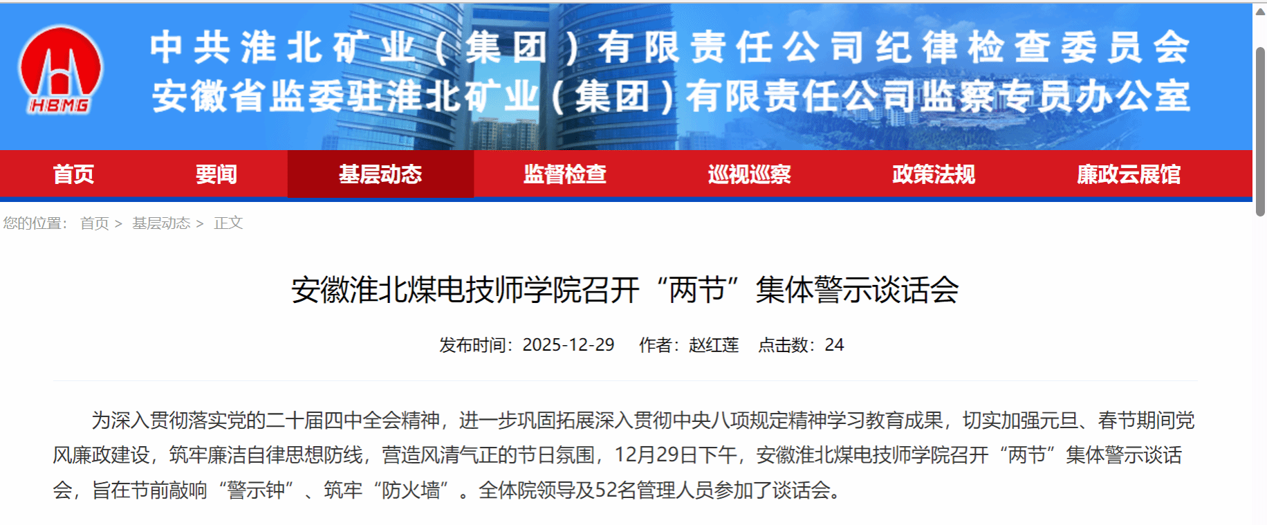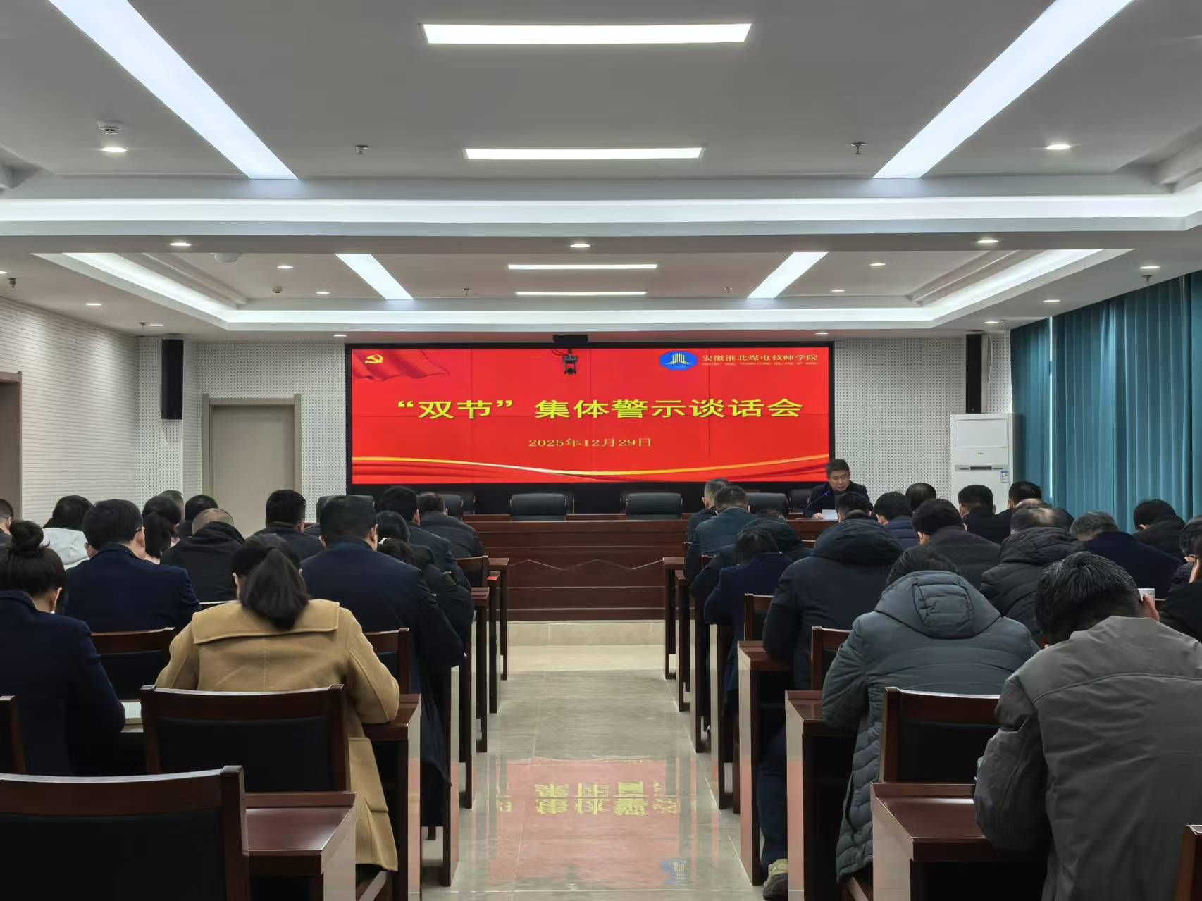 为深入贯彻落实党的二十届四中全会精神,进一步巩固拓展深入贯彻中央八项规定精神学习教育成果,切实加强元旦、春节期间党风廉政建设,筑牢廉洁自律思想防线,营造风清气正的节日氛围,12月29日下午,安徽淮北煤电技师学院召开“两节”集体警示谈话会,旨在节前敲响“警示钟”、筑牢“防火墙”。全体院领导及52名管理人员参加了谈话会。