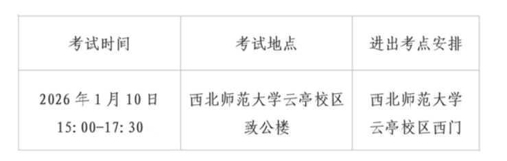 笔试考点设在西北师范大学云亭校区(地址:兰州市安宁区安宁东路967号),面试考点设在西北师范大学知行校区(地址:兰州市安宁区邱家湾37号)。