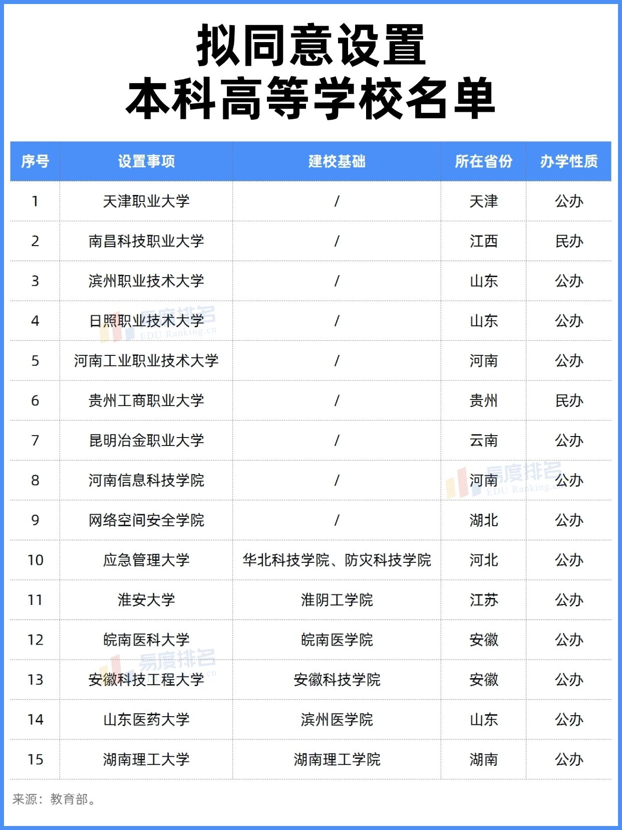 1月4日,教育部发布《关于拟同意设置本科高等学校的公示》,宣布根据《中华人民共和国高等教育法》《普通本科学校设置暂行规定》等相关法规,经教育部党组会议审议通过,拟同意设立包括天津职业大学、南昌科技职业大学等在内的15所本科高等学校,目前正面向社会公示。