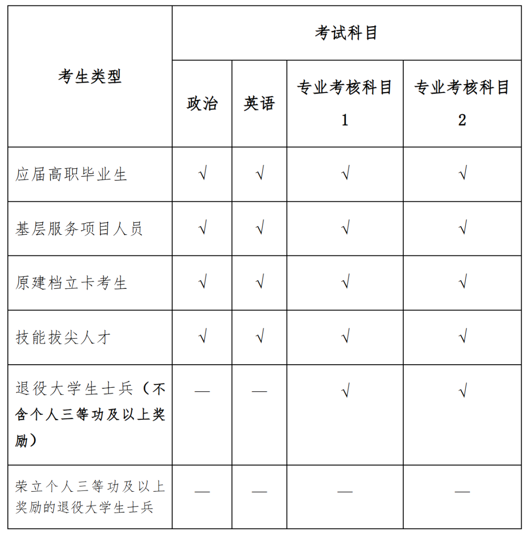 按照《河北省教育厅关于优化调整河北省普通专升本考试科类及科目设置的通知》(冀教学〔2023〕19 号)要求,普通专升本考试科目设公共文化考试和专业综合(职业适应性)考核(简称“专业综合考核”,下同)两部分,总分500分。公共文化考试包含政治、英语2个科目,每科目满分100分。专业综合考核包含专业考核科目1和专业考核科目2(详见上述通知附件2),每科目满分150分。各类考生具体考试科目如下(‘√’表示需要参加考试,‘—’表示免试):