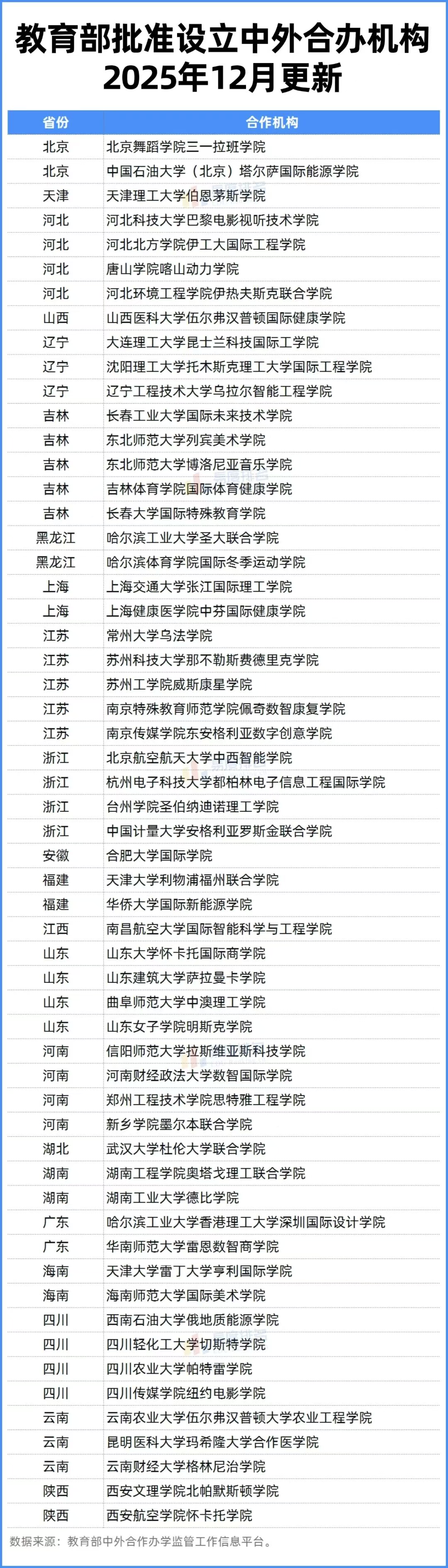 近日,教育部公布了最新一批中外合作办学机构和项目审批结果,超百所高校新增设立的57家中外合作办学机构获批。吉林和江苏分别新增5家机构,河北、河南、山东、四川和浙江则分别新增4家。