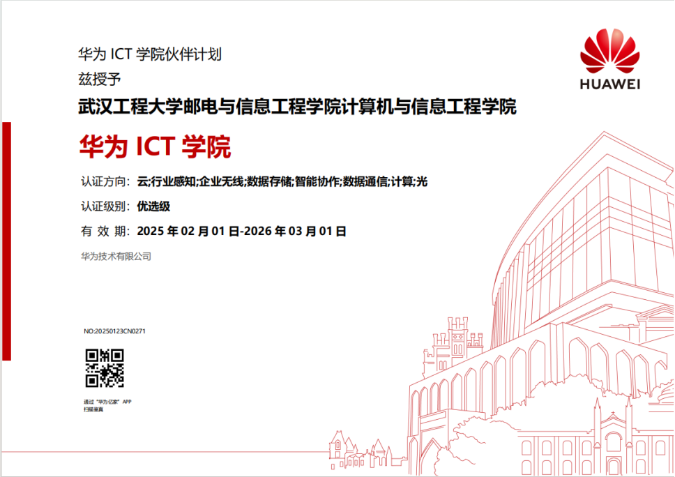 武汉工程大学邮电与信息工程学院计算机与信息工程学院(人工智能学院)积极推进产教融合,构建“1+X+N”人才培养模式,建成“优选级华为ICT学院”,打造符合产业需求的课程体系,形成校企协同育人的新课堂,培养学生的创新与职业技能,助力其获取学科竞赛与职业认证证书,定位培养信息与通信技术(ICT)类应用型卓越工程师。