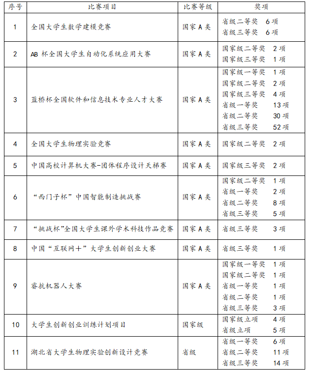 武汉工程大学邮电与信息工程学院计算机与信息工程学院(人工智能学院)积极落实“素质、知识、能力”三位一体的人才教育新模式,秉承“以赛促教、以赛促学、以赛促改”的理念,搭建多方联动的学科竞赛平台,建立可持续的竞赛机制。近三年来,学院组织学生参与多项国家级、省级学科竞赛和创新创业项目活动,锻炼和培养学生的综合应用与创新能力,并取得丰硕成果。