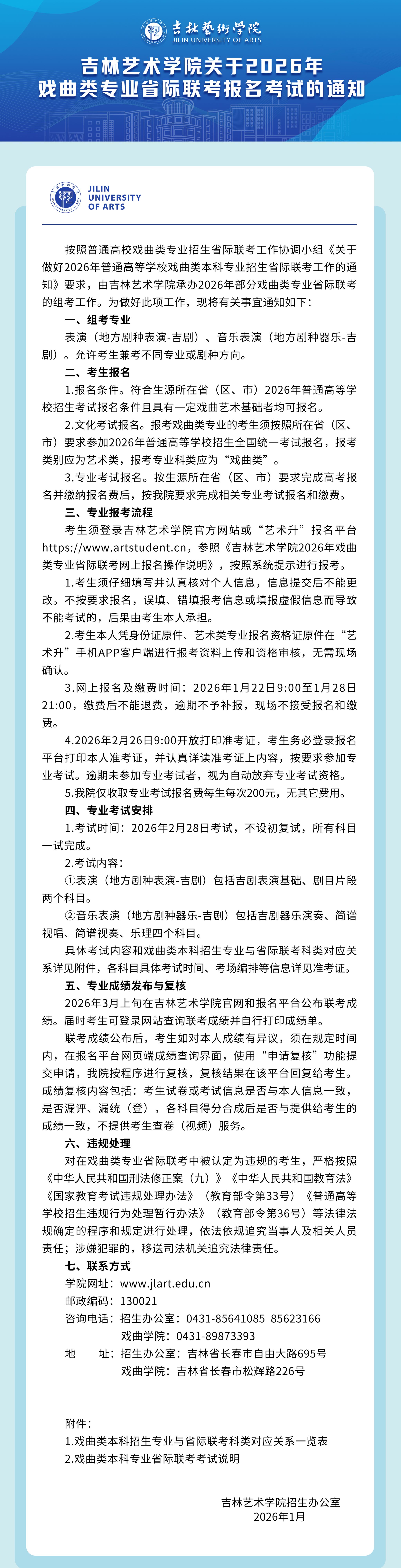 吉林艺术学院关于2026年戏曲类专业省际联考报名考试的通知