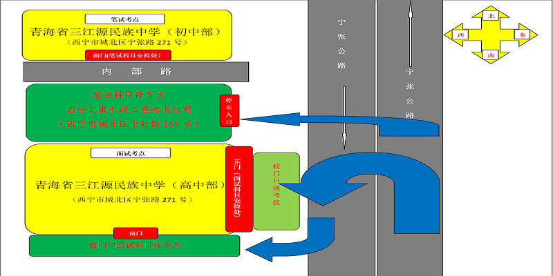 5.面试科目送考车辆,可在宁张公路三江源民族中学高中部东门口位置掉头,待考生下车后,立即驶离或前往三江源民族中学高中部南门口停车点停放。考试结束后考生由南门口离开考点。