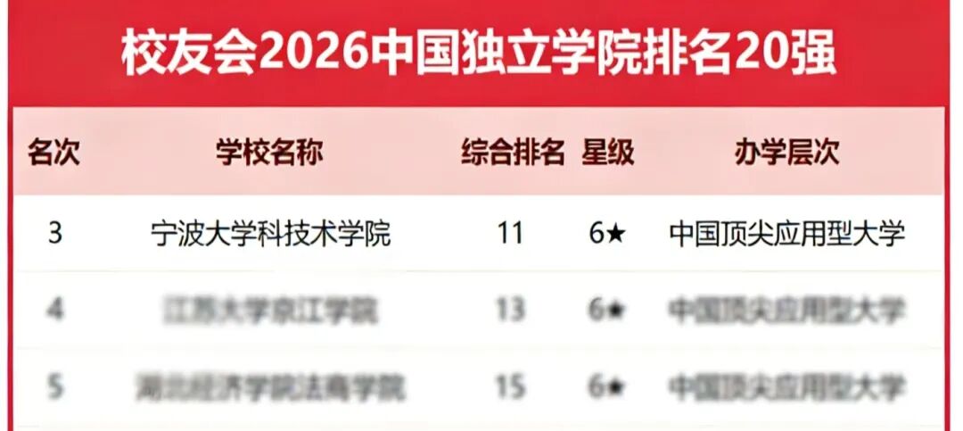 1月12日,全国第三方大学评价研究机构艾瑞深校友会网正式发布校友会2026中国大学排名。在2026中国独立学院排名中,我校获评六星级(6★),再次跻身中国独立学院前三甲,位列全国第三、浙江省第一!在2026中国民办大学排名(Ⅱ类)中,我校名列第11位。