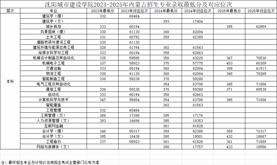 内蒙古2023-2025年招生专业录取最低分数线及对应位次