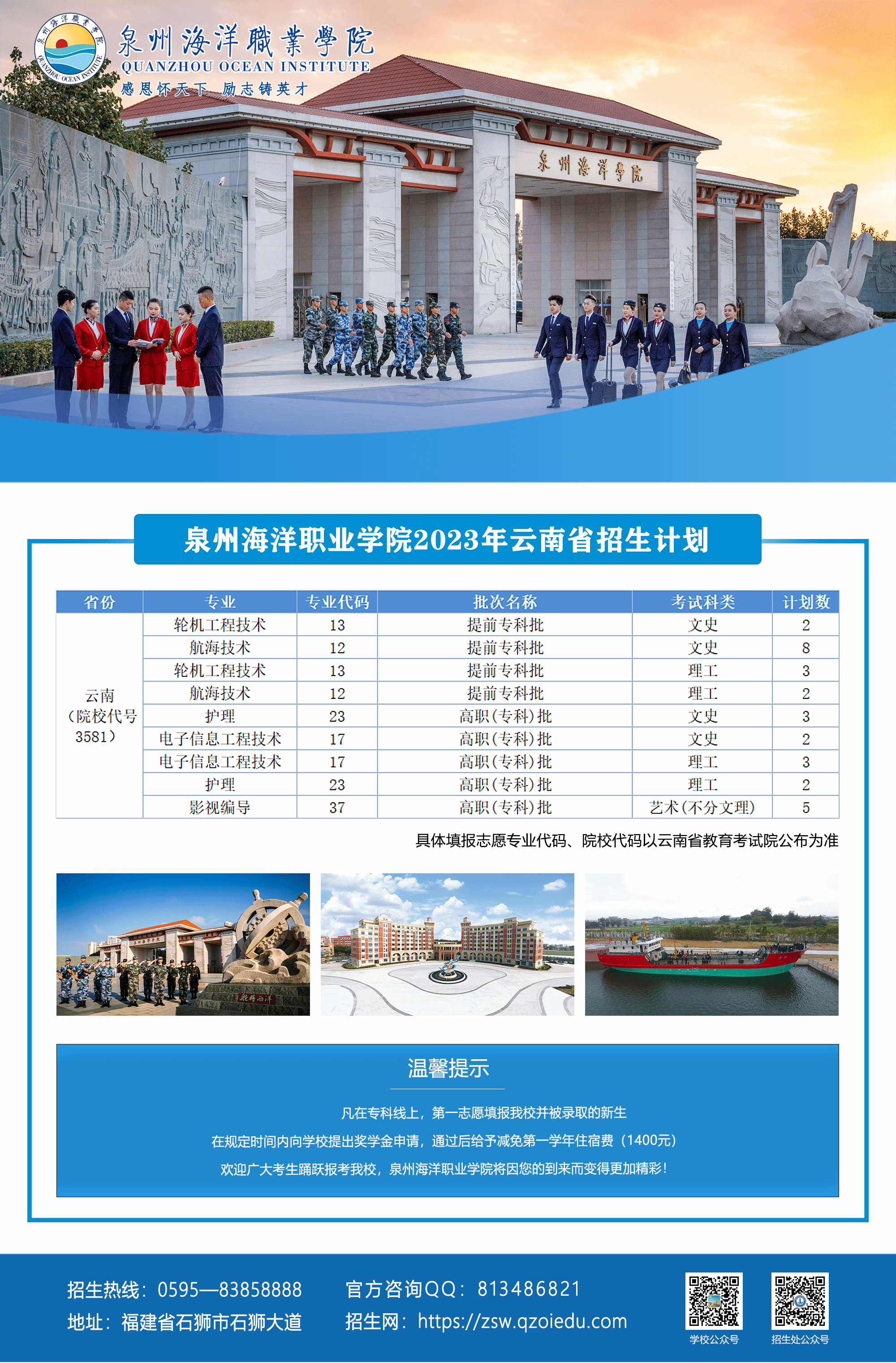 泉州海洋职业学院2023年云南省招生计划