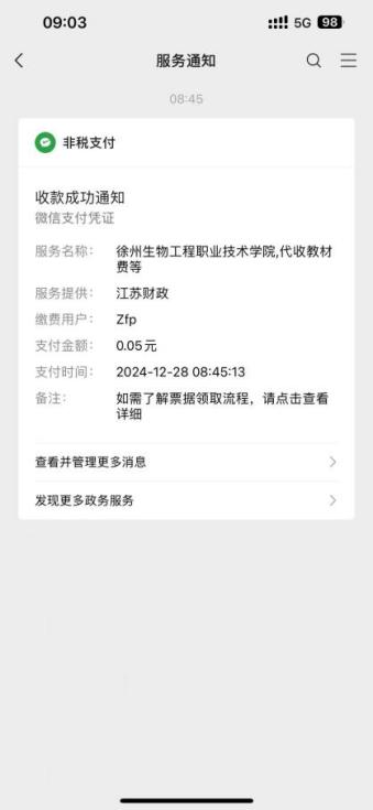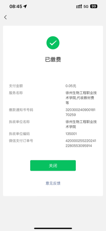 支付成功后弹出已缴费界面,可在微信服务通知查看缴费详情。