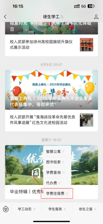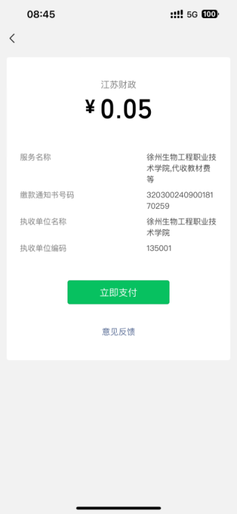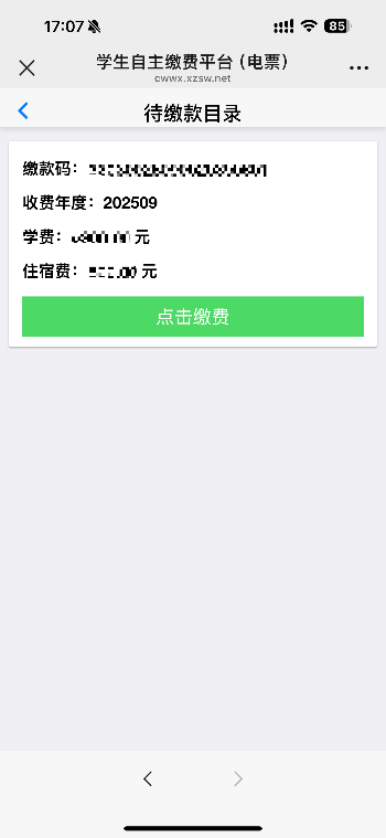 进入【徐生学工】微信公众号,点击【学生服务】版块【学费住宿费】栏目跳转【学生自主缴费平台(电票)】,点击【学生缴费】在【学号/身份证】处输入2025级新生身份证号码后点击【查询】。