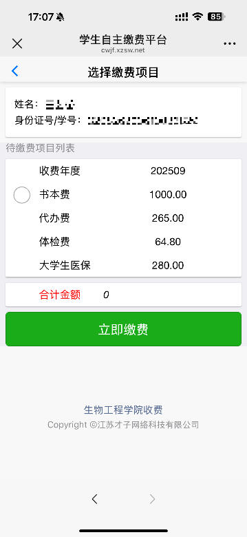 进入【徐生学工】微信公众号,点击【学生服务】版块【代办费】栏目跳转【学生自主缴费平台】,点击【学生缴费】进入后在【学号/身份证】处输入2025级新生身份证号码获取缴费项目及金额。2025级新生代办费含:代收书本费1000元、代办校服军训服费265元、体检费64.8元、大学生医保费280元。确认无误后点击左侧“ ”勾选缴费项目后点击【立即缴费】。缴费信息可通过订单查询获取。