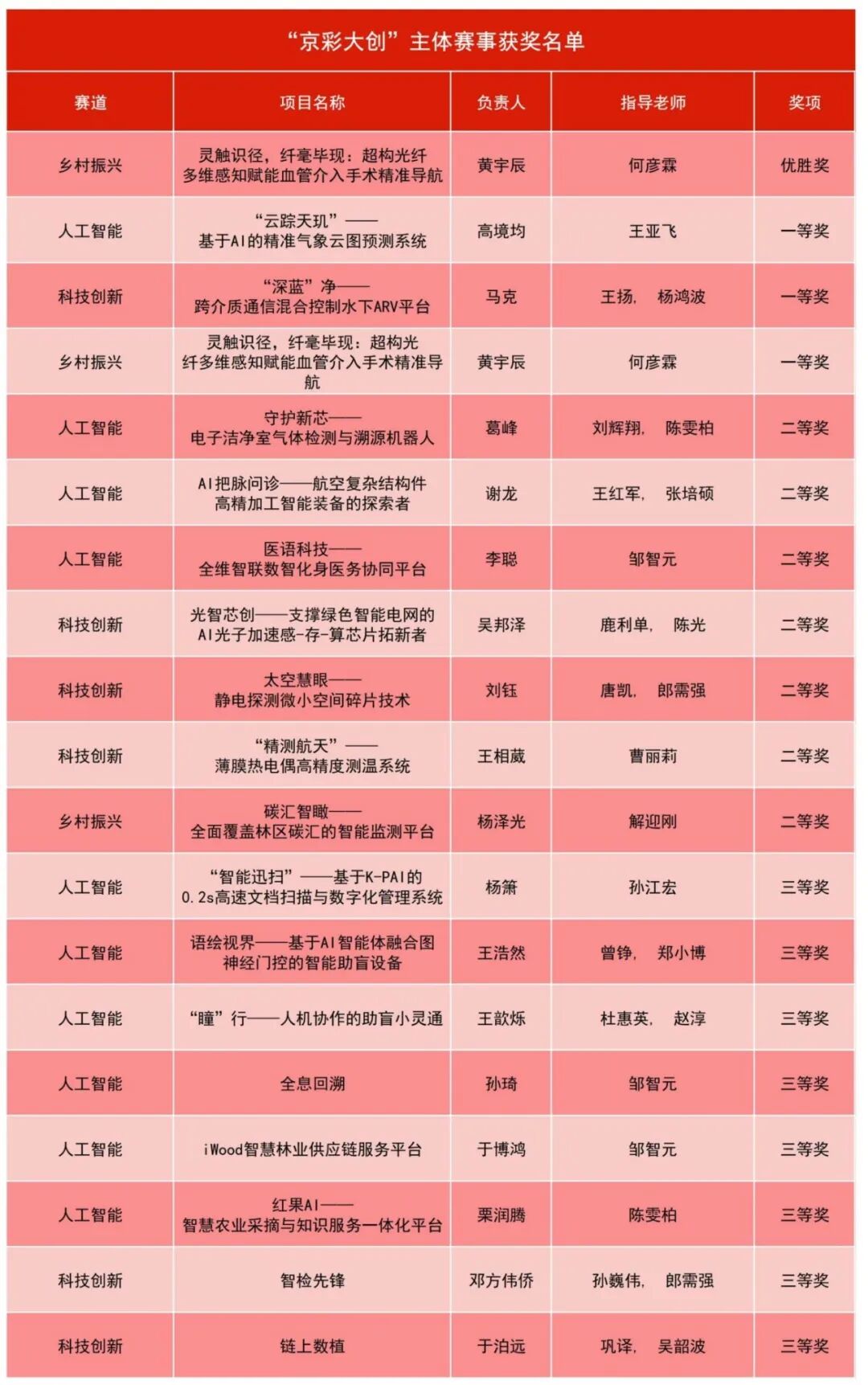 我校获奖项目覆盖主体赛事、华为产业应用赛事,奖项涵盖乡村振兴、人工智能、科技创新等多个赛道,充分展现了学校学科交叉融合的创新优势。主体赛事中,获得19项奖励,其中“灵触识径,纤毫毕现:超构光纤多维感知赋能血管介入手术精准导航”项目凭借前沿技术与实用价值获评优胜奖;在华为产业应用赛事昇腾赛道,获得7项奖励,其中“分治”团队成功突围获得优胜奖。
