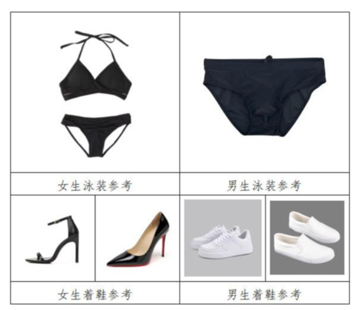 (3)考生按组赤足进行形体形象观测,本组形体形象观测结束后,考生着台步展示考试用鞋(女生着黑色高跟鞋、男生着纯白色板鞋,详见参考图)进行台步展示。