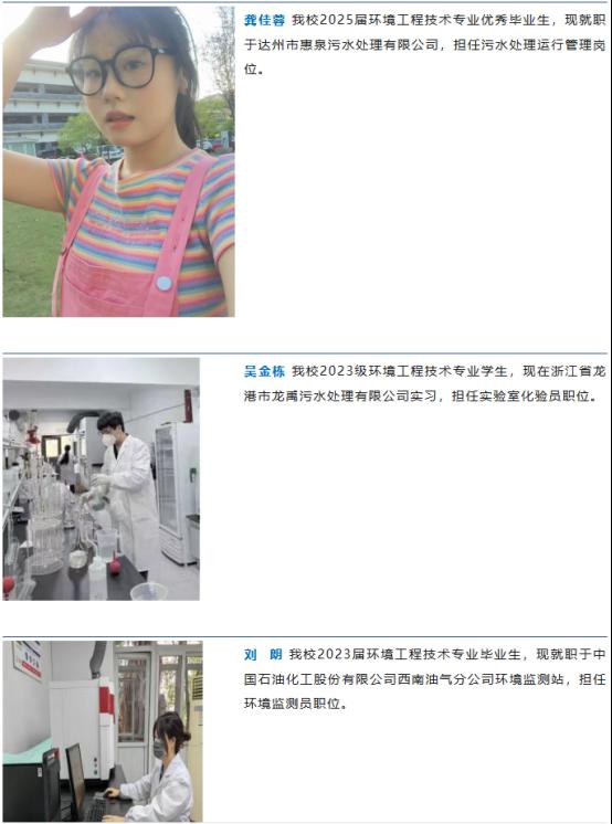 学院已与四川奥恒环保科技有限公司、四川金朋工程管理咨询有限公司、美富特环保产业集团有限公司、绵阳铂瑞斯环保科技有限公司、四川阳晨环境工程投资有限公司等77家环保企业签约合作,为学生提供实习平台。学生毕业之后可以选择进入签约合作企业工作或自主选择川渝地区上千家环保公司实习和就业。在生态环保公司、环境监测站、能源等环保行业企业,从事环保设施运营与管理、环境工程施工管理、环保设施安装调试与运营管理、环境工程设计与技术开发、自动在线监测设备运营、环境样品采集与监测等工作。