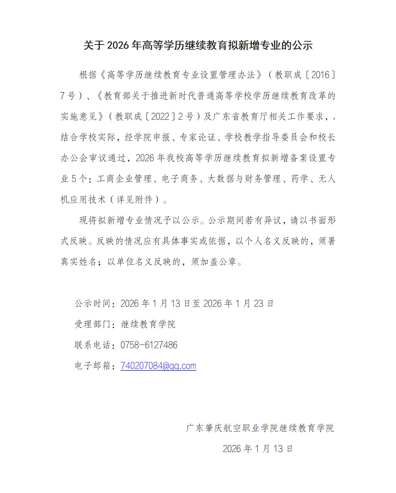 关于2026年高等学历继续教育拟新增专业的公示