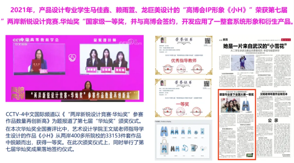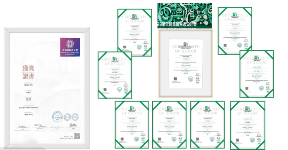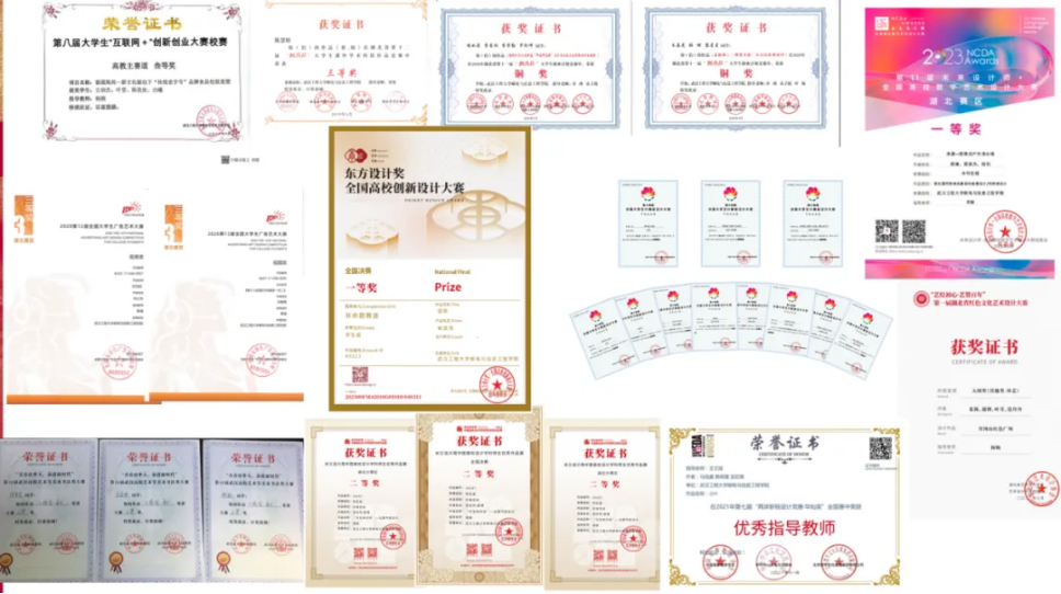 近三年,艺术设计学院教师组织、指导学生参加全国普通高校学科竞赛榜单赛事获奖总数达到300余项,其中国家级奖项30余项、省市级奖项200余项,78名师生荣获“我为乡村做设计”志愿者服务证书,武汉工程大学邮电与信息工程学院艺术设计学院荣获武汉文化创意设计大赛“最佳组织奖”。