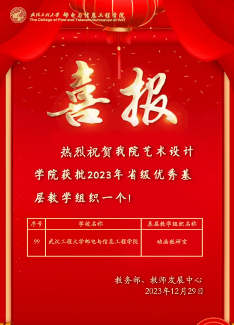 武汉工程大学邮电与信息工程学院艺术设计学院积极推进特色示范课程建设,《品牌设计》获批湖北省一流本科课程、《展示设计》获批湖北省精品资源共享课程,还建设有院级思政课程1门、院级精品资源共享课程5门,教师主持湖北省教育教研、人文社科等项目10余项,编写出版教材30余部,发表论文200余篇。其中,动画教研室获批2023年省级优秀基层教学组织,充分发挥课程思政示范引领作用,推动人才培养质量持续提升。