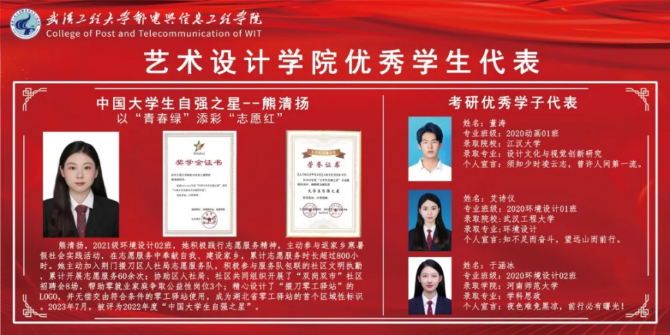 近年来,武汉工程大学邮电与信息工程学院艺术设计学院培育出“中国大学生自强之星”2021级环境设计专业熊清扬、“长江学子”优秀校友王涛等一批典型榜样,凝练育人特色不断提升人才培养效能。毕业生就业领域主要面向:城市规划企事业单位、设计品牌传媒公司、工业设计公司,艺术考研学子被湖北美术学院、武汉工程大学、英国拉夫堡大学等国内外高校录取,育人成果受到社会业界、行业领域的一致认可。