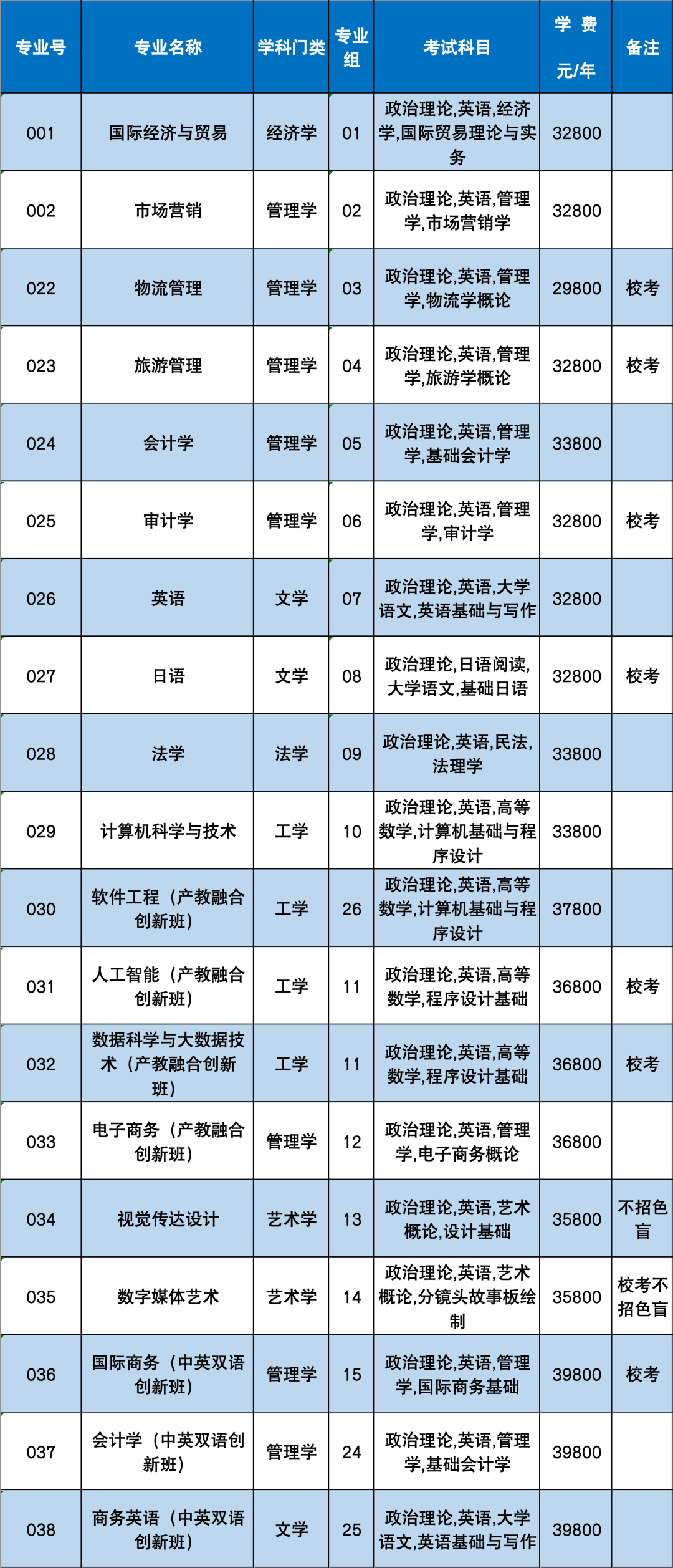 2.校考专业:物流管理、旅游管理、审计学、日语(增加一门专业课)、人工智能(产教融合创新班)、数据科学与大数据技术(产教融合创新班)、数字媒体艺术、国际商务(中英双语创新班)等专业的专业综合课由我校自行组织命题,相关参考教材和考试大纲详见我校招生信息网。我校自行组织命题的日语专业课《日语阅读》考试时间安排在2026年3月22日下午(14:30-16:30)、其他专业综合课考试时间安排在3月22日上午(9:00-11:30)。