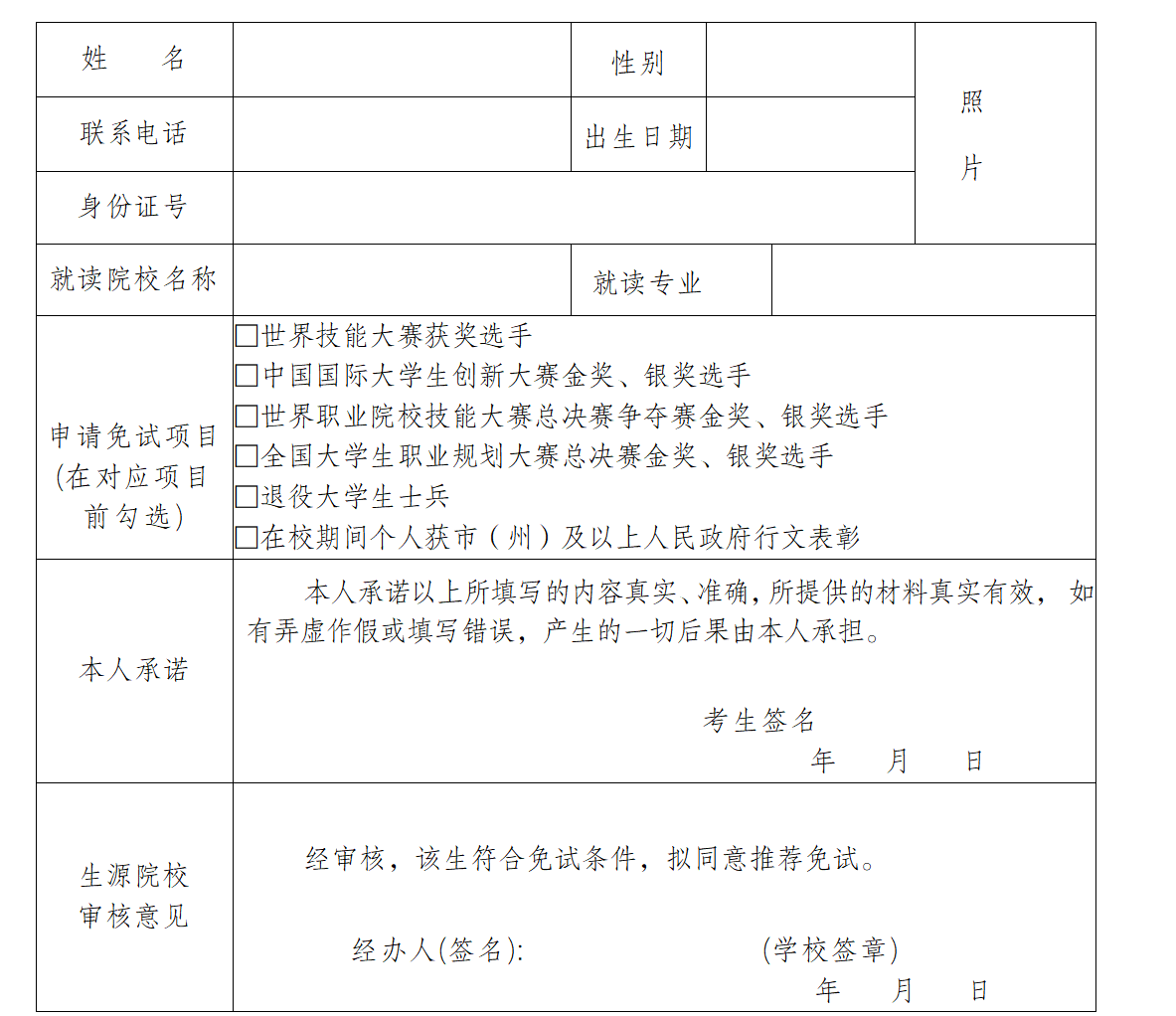 1.本表由考生本人填写,要求内容准确无误,“本人承诺”栏须为本人亲笔签名。