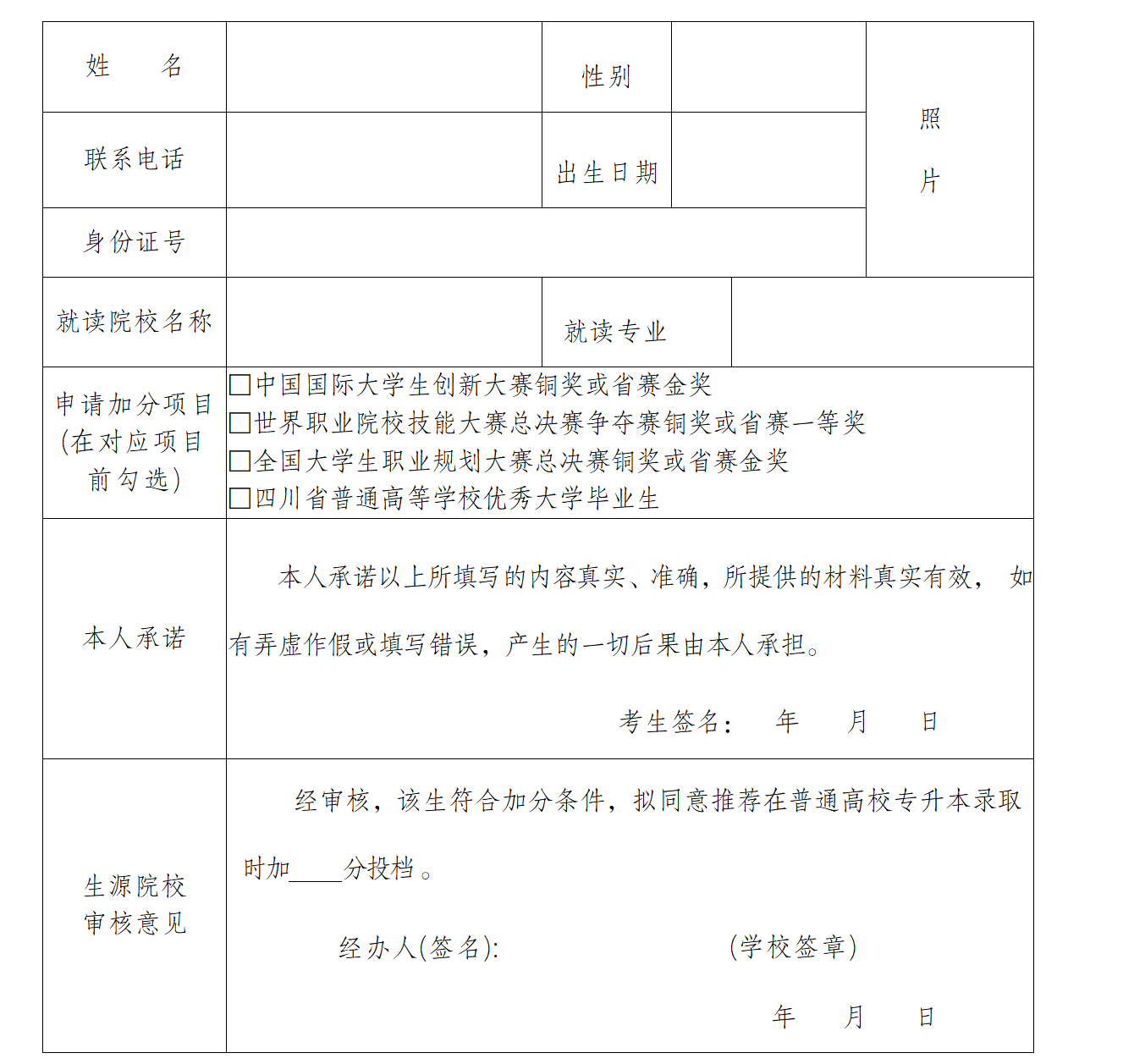 3.《四川省2026年普通高校专升本免试申请表》(免试生提供)或《四川省2026年普通高校专升本加分申请表》(加分考生提供)。