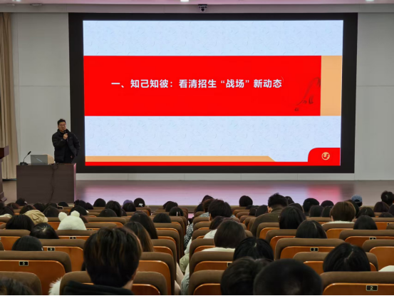 培训会上,李老师首先展开了一场务实又生动的动员。他从招生宣传的现今形势出发,引导同学们“看清招生新形势”,深入剖析当前高校招生的新变化、新特点与新挑战,强调在信息纷繁的时代,宣讲人须具备清晰的判断能力、灵活的应变能力和出色的沟通能力。