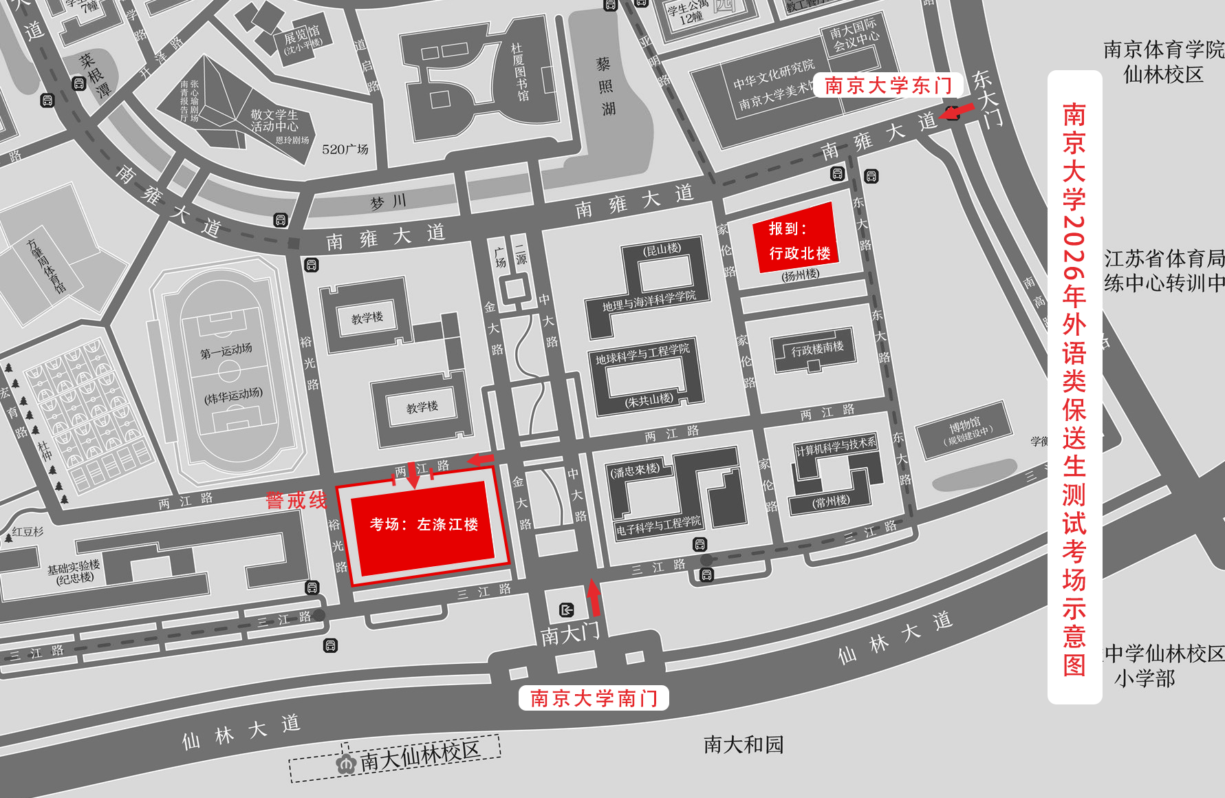 请考生本人持有效身份证,于2026年1月16日9:00-12:00至南京大学仙林校区行政北楼128室现场报到,领取准考证。未按时报到者视为放弃考试资格。考试安排在我校仙林校区进行,1月16日进行笔试,1月17日进行面试,具体安排见准考证。请考生提前仔细阅读考生须知等相关文件,做好考试准备。