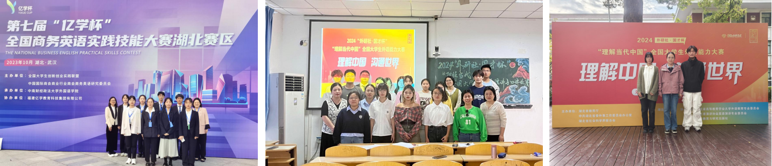 通过以"赛"促"学"、以"赛"促"教",将学科竞赛内容和标准、职业技能要求融入专业人才培养方案。通过举办"外研社·国才杯"全国大学生英语系列比赛、湖北省翻译大赛、全国高校商务英语竞赛、模拟法庭大赛等,学以致用,全面提升学生的创新能力、综合素质和实践能力。