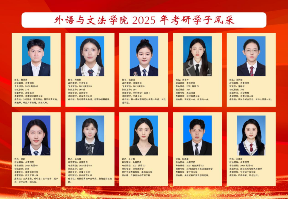 外语与文法学院秉承“厚基础,重内涵,强能力”的人才培养理念,以“严明课堂纪律、培养优秀习惯、加强学业指导、加大典型宣传、营造书香氛围”为重点,加强教风、学风、院风建设,鼓励广大青年向榜样看齐,领略标杆风采,感受奋斗的青春力量。