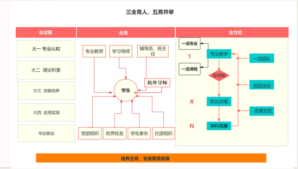 英语、商务英语和法学专业四年全程实行校内+校外导师制,学生和导师之间进行双向选择,以生为本、因材施教、精细化培养。