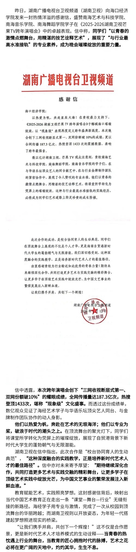 以热爱为帆,共赴星辰大海——湖南卫视致函盛赞海经艺术学子