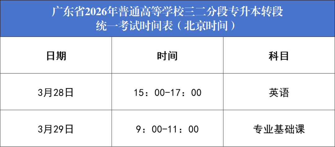 1.普通高校转段招生的统一考试科目为两门,一门公共基础课和一门专业基础课。统考科目与普通专升本统考科目统一命题,统一考试,统一评卷。公共基础课为英语(外国语言文学类中非英语类专业的公共基础课由招生院校自行组织),专业基础课根据专业的不同要求分别为大学语文、高等数学、管理学、教育理论、艺术概论、民法、生态学基础、生理学,三二分段专升本转段试点本科高校名单、试点招生专业及对应的专业基础课详见《广东省2026年普通高等学校三二分段专升本转段招生高校及专业对应表》。