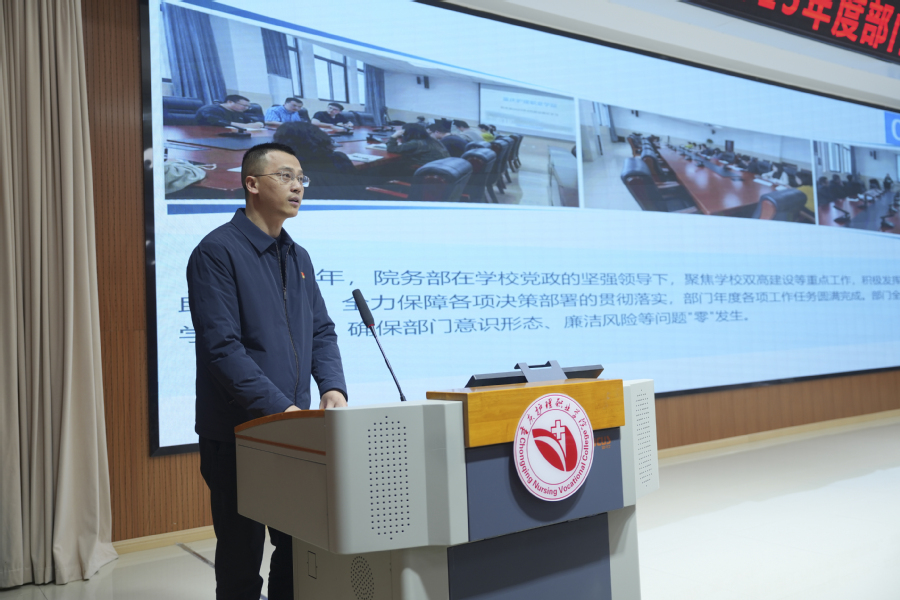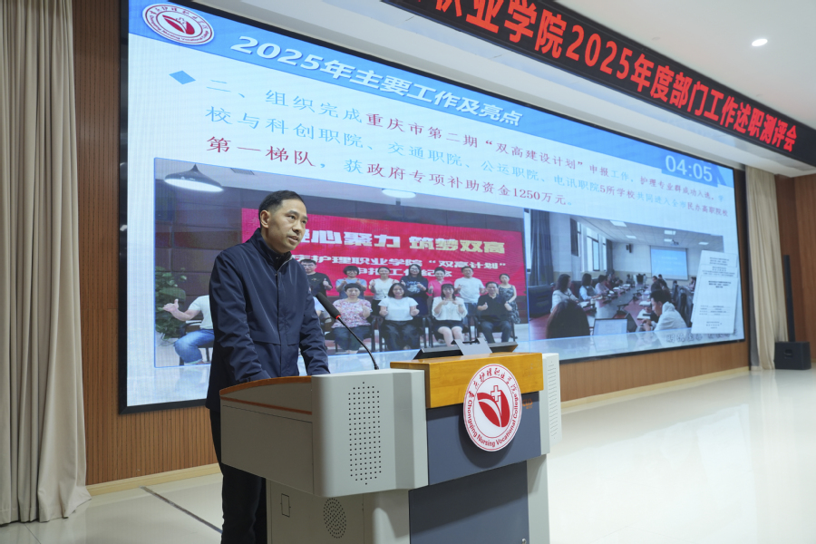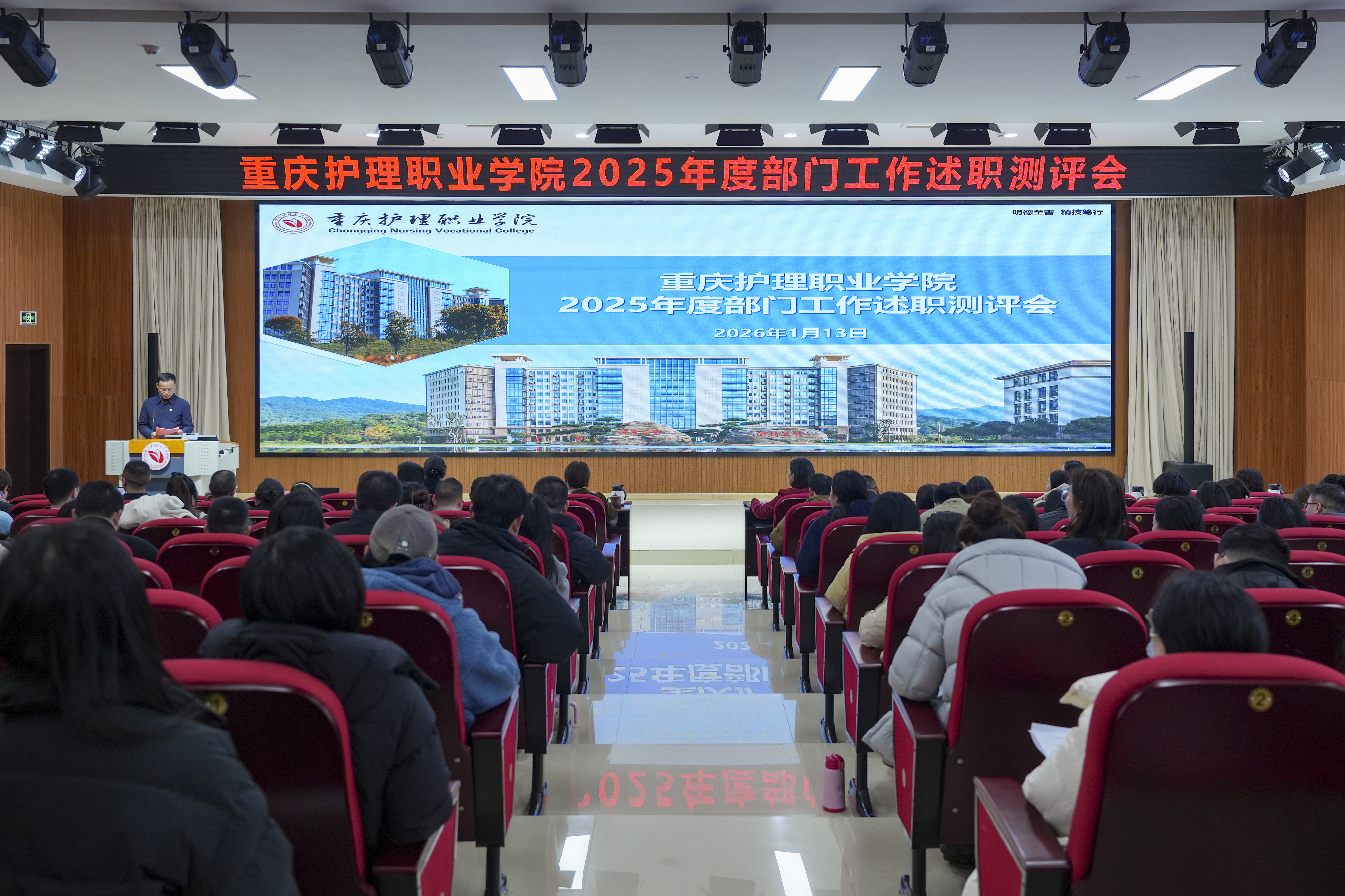 2026年1月13日,学校2025年度部门工作述职测评会在明德楼104学术报告厅召开。学校党政领导班子成员、全体教职工参加大会,会议由副校长唐全主持。