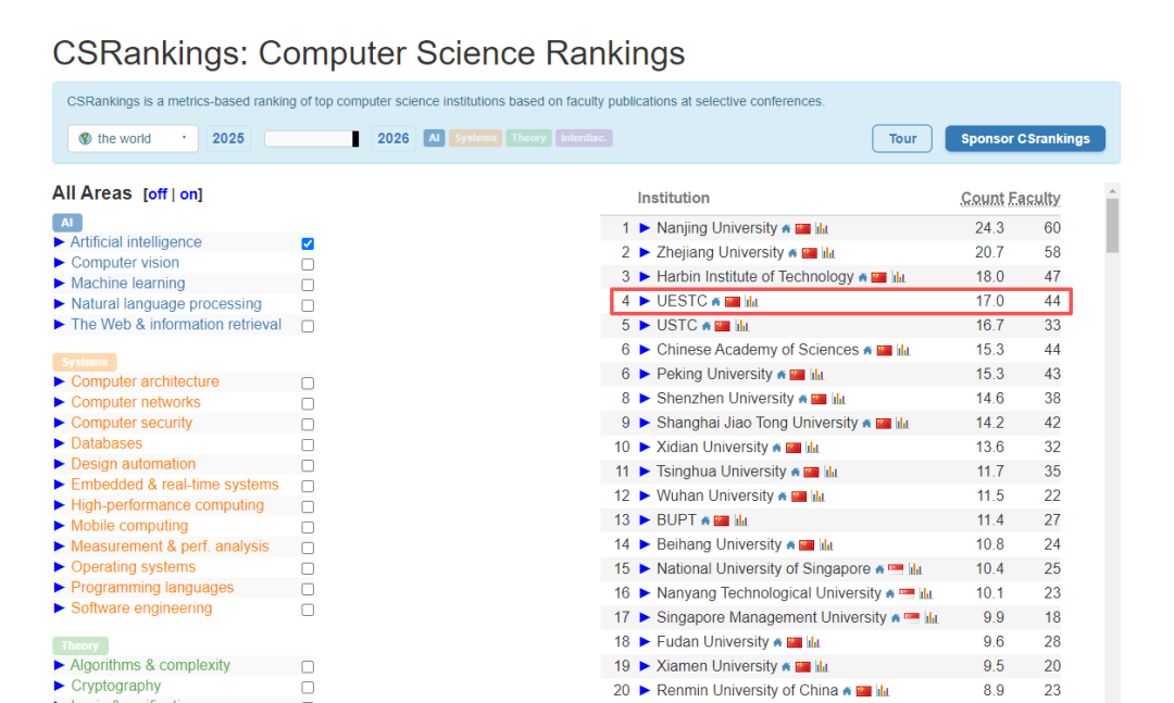 CSRankings (Computer Science Rankings) 是一个基于各种会议论文指标的计算机科学机构的全球性排名网站。它以全球高校和研究机构在计算机领域的顶级学术会议上发表论文数量作为主要依据,在一定程度上反映了全球高校和研究机构在计算机学科和相关方向上的学术影响力和国际活跃度。