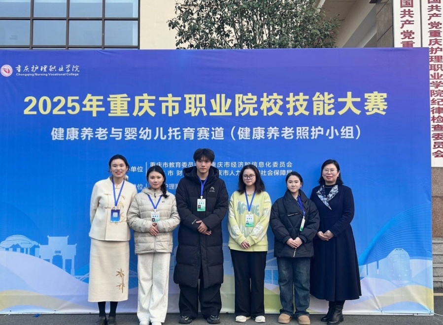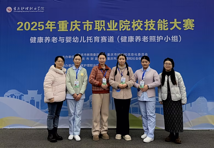 2026年1月16日,在我校承办的2025年重庆市职业院校技能大赛健康养老与婴幼儿托育赛道(高职组)健康养老照护小组比赛中,由陈娜、汪茂莎老师指导,杜宇杰、刘祥红、马顺欣、毛石娟组成的参赛团队;以及由陈梦华、贾媛老师指导,杨悦、吴依娜、李辛夷、刘俊杰组成的参赛团队,凭借精湛的专业技能与出色的团队协作,双双荣获该赛道金奖。