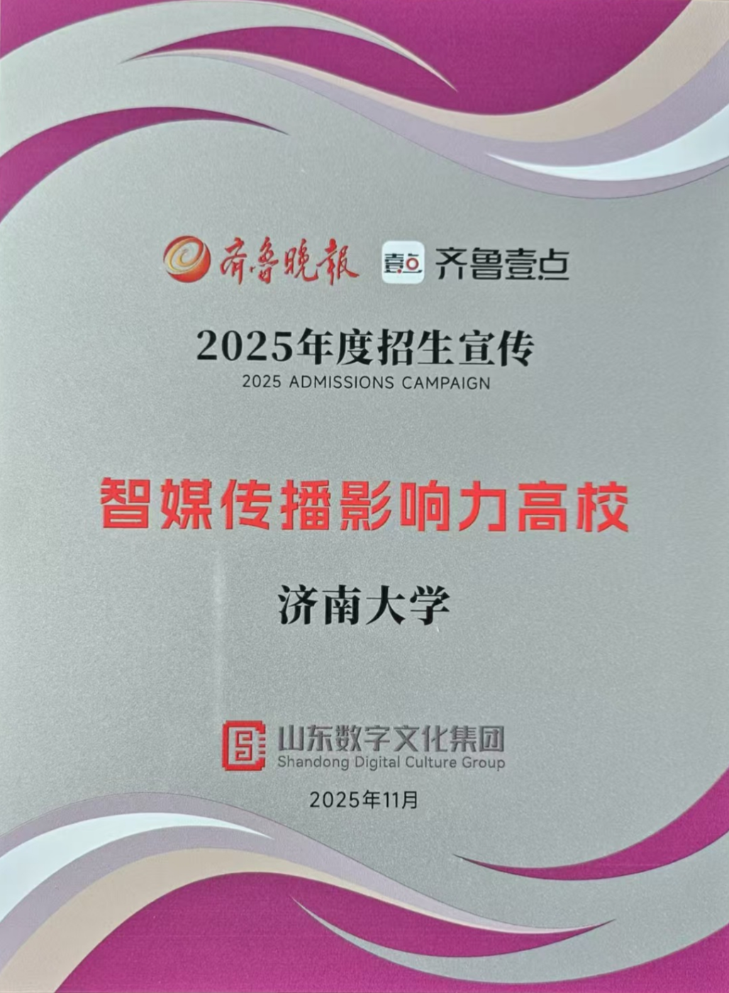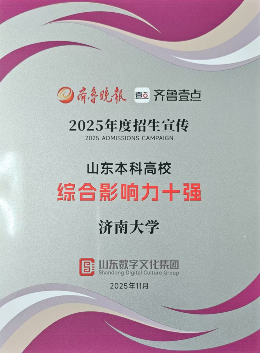 11月,齐鲁晚报·齐鲁壹点授予“2025年度招生宣传智媒传播影响力高校”“2025年度招生宣传山东本科高校综合影响力十强”——双奖加身,见证我校招生宣传新媒体平台传播实力与综合影响力!