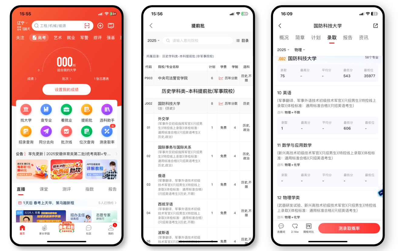 例如,考生输入分数、选科,在【提前批栏】中选择【本科提前批(军事院校)】类别,系统可标注目标院校近历年录取最低位次、体检要求(如视力、身高限制),并计算录取概率,避免因信息差导致第一志愿填报失误。