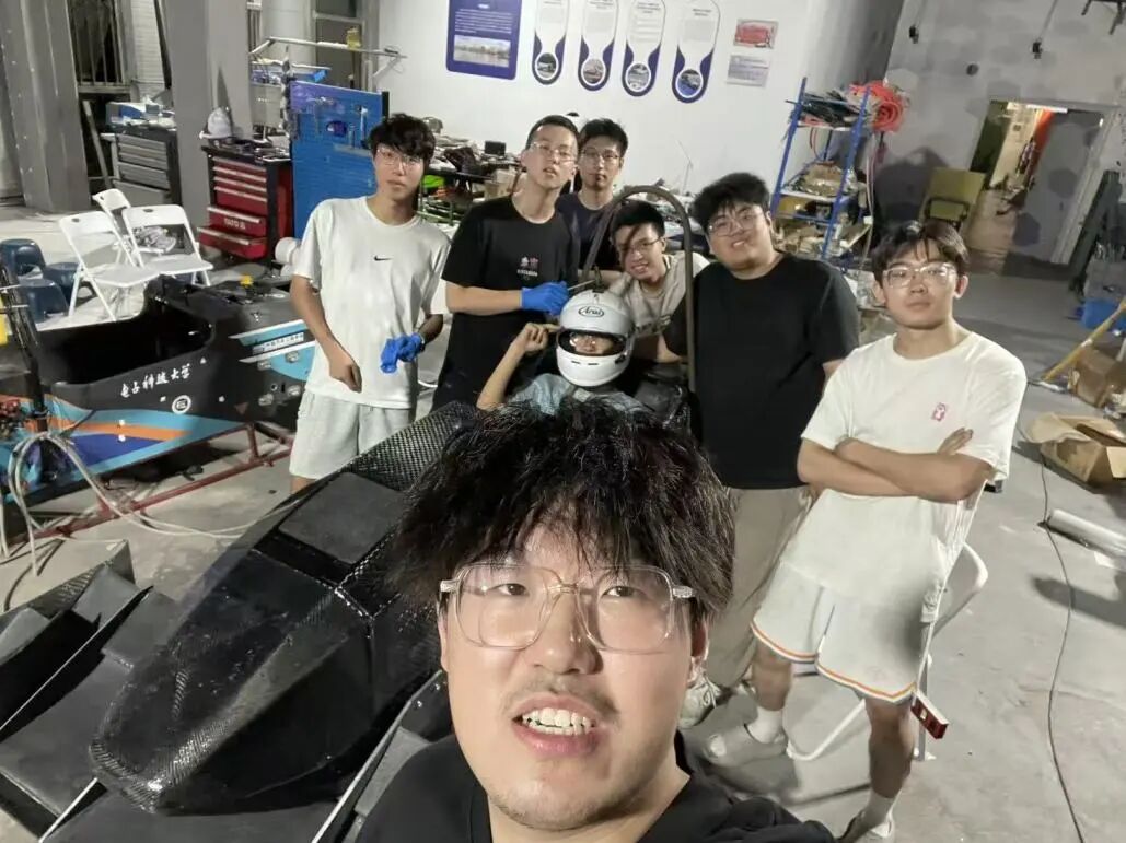 2025年夏天,为了完成赛车单体壳和空套的加工,杨青松带领几名队员远赴扬州。当地的加工车间里,高温接近40℃,没有空调,队员们每天从清晨忙到深夜,汗水浸透了队服,却没有人喊过一句苦。