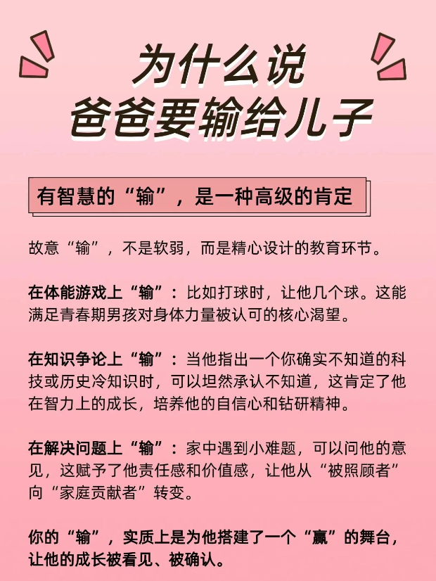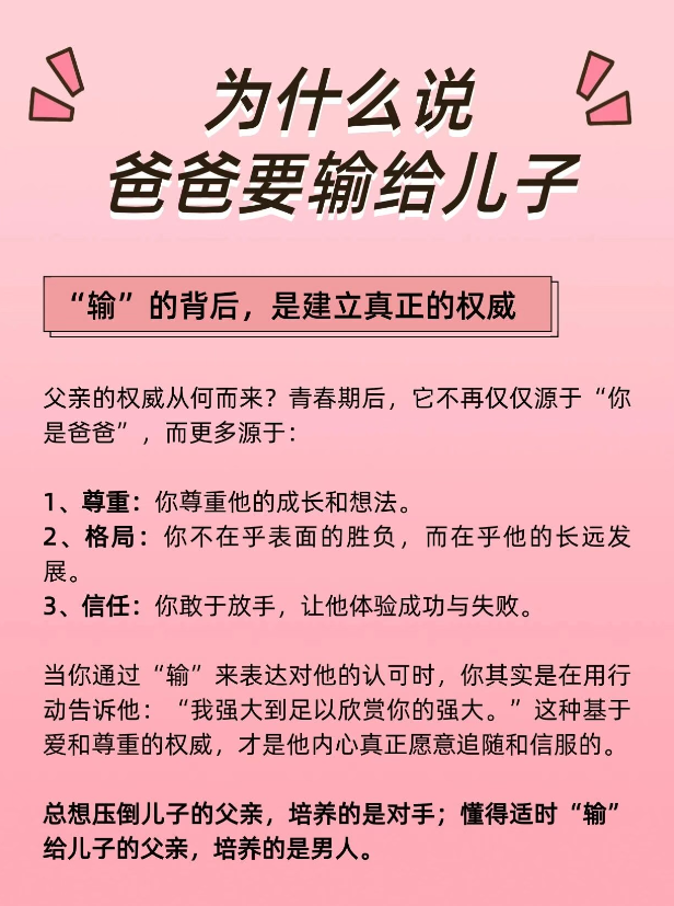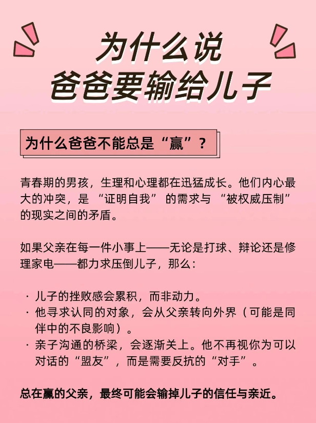 许多父亲习惯在儿子面前保持“权威形象”,事事占上风。但事实上,在儿子进入青春期后,有智慧的父亲,会开始学习如何“输”。