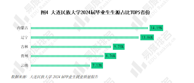 许多民族院校的核心使命之一就是为所在民族地区培养和输送人才。大连民族大学2024届毕业生生源占比最高的省份是内蒙古,本省生源占比屈居第二,由于其独特的生源结构,该校毕业生在辽宁省的就业占比相对较低。