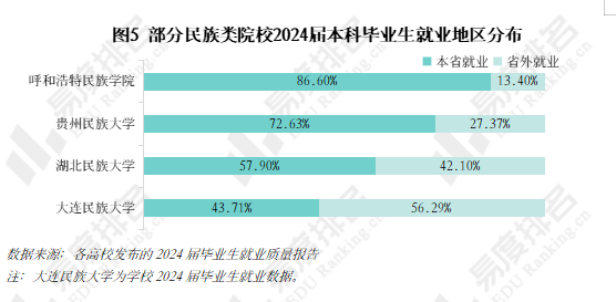 呼和浩特民族学院、贵州民族大学位于少数民族相对集中的地区,其毕业生在本省就业占比相对较高,呼和浩特民族学院2024届毕业生在内蒙古就业占比高达86.6%。