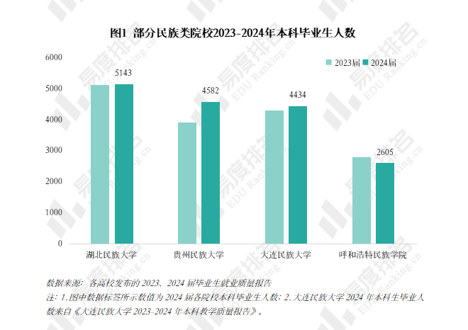 相较于上一年度,湖北民族大学、贵州民族大学、大连民族大学2024届本科毕业生人数均增加,其中贵州民族大学本科毕业生人数上涨幅度较大。呼和浩特民族学院2024届本科毕业生人数较上一年度减少。