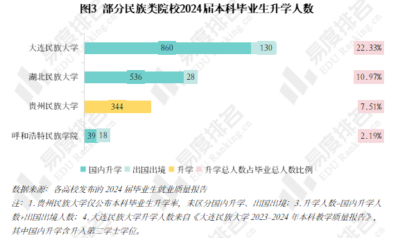 民族类院校2024届本科毕业生升学人数占比整体较低,大连民族大学升学人数占比相对较高,2024届本科升学人数占比为22.33%,贵州民族大学、呼和浩特民族学院2024届本科升学人数占比均不足10%,其中呼和浩特民族学院升学人数占比仅为2.19%。